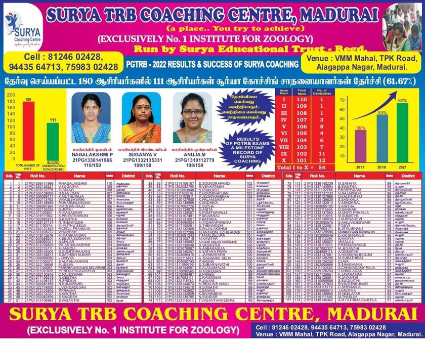 Welcome to Surya Coaching Centre, recognized as one of the premier Government Jobs coaching institutions in Tamilnadu . Our center is highly regarded for its exceptional services and dedication to student achievement. We offer comprehensive coaching for PG TRB Zoology, TET, TNPSC facilitated by our highly skilled and experienced faculty. At Surya Coaching Centre, we are committed to delivering high-quality lessons taught by expert educators to support your academic and professional aspirations.